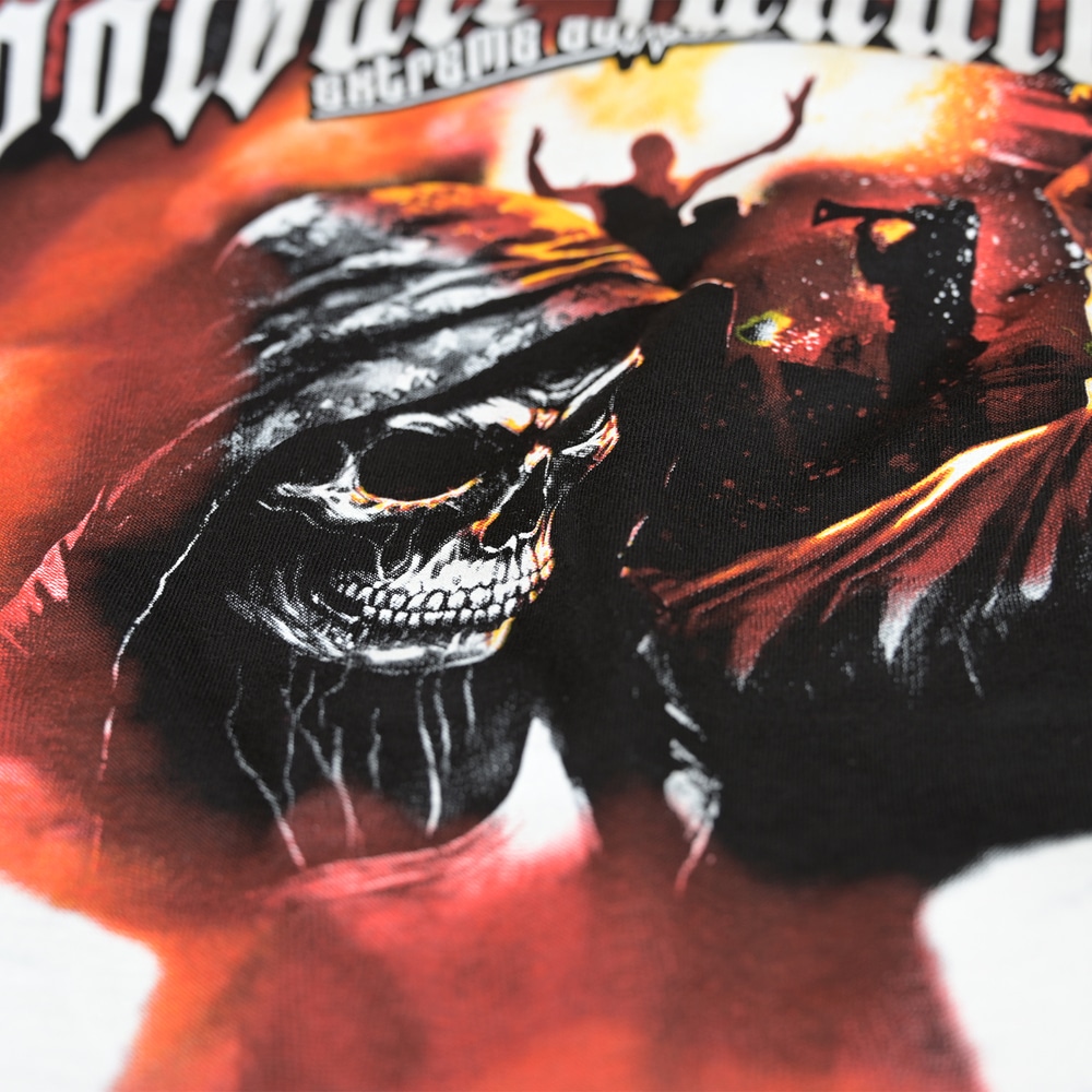 SZITANYOMÁSSAL KÉSZÜLT FEKETE PAMUT PÓLÓ, NAGYMÉRETŰ MINTÁK ELÖL ÉS HÁTUL.